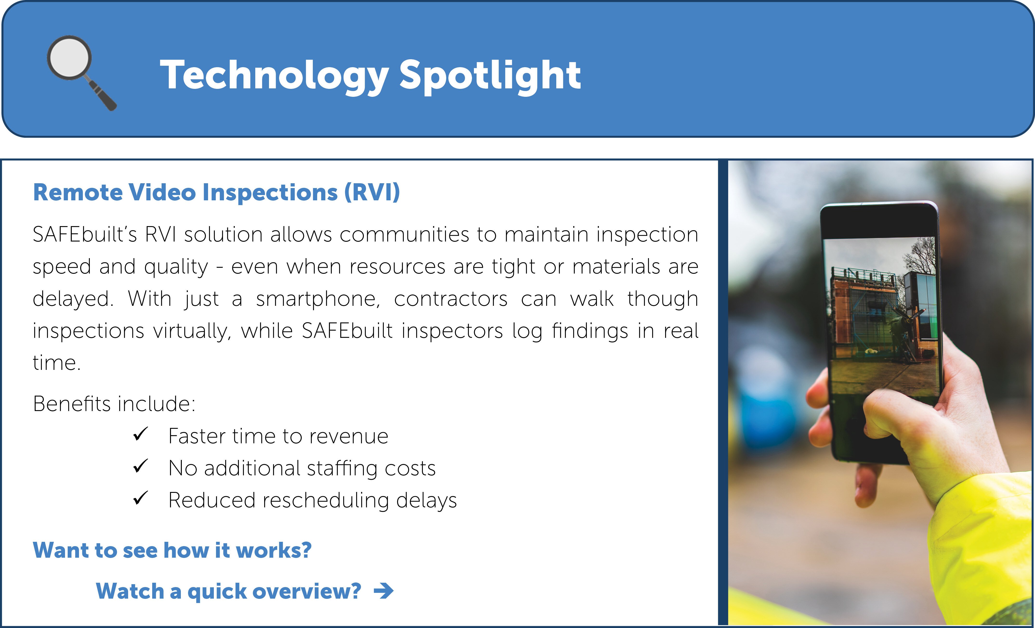A great example showcasing how technology can improve a building department’s efficiency is SAFEbuilt’s Remote Video Inspections (RVI). Communities need the ability to create additional layers of flexibility during uncertain times. RVI helps our community partners increase their speed to revenue without increasing their cost of service. This is a powerful tool that delivers reliability and predictability when communities are faced with unexpected changes.